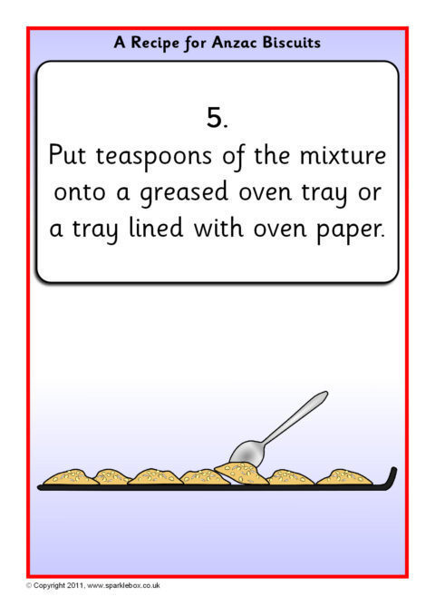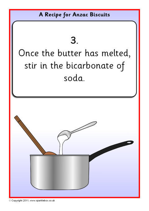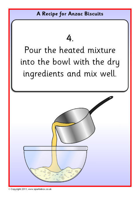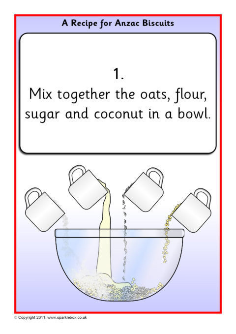 A useful set of simple visual aids showing how to make Anzac biscuits.