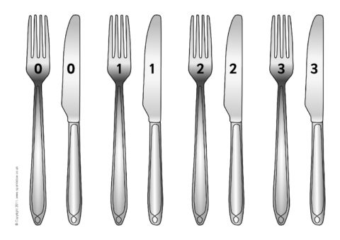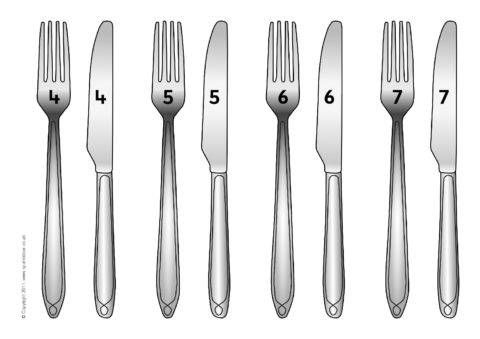 A printable activity where children match together the knives and forks to make the numbers on the plates.