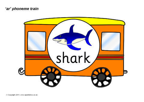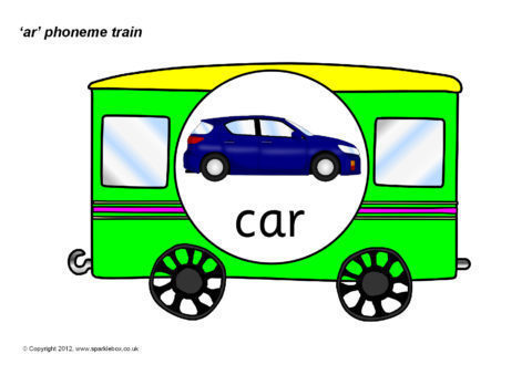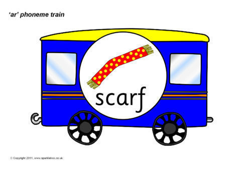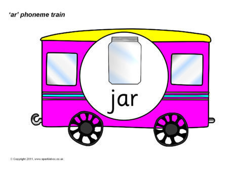 A printable train engine and carriages featuring pictures of objects that have the phoneme ‘ar’.