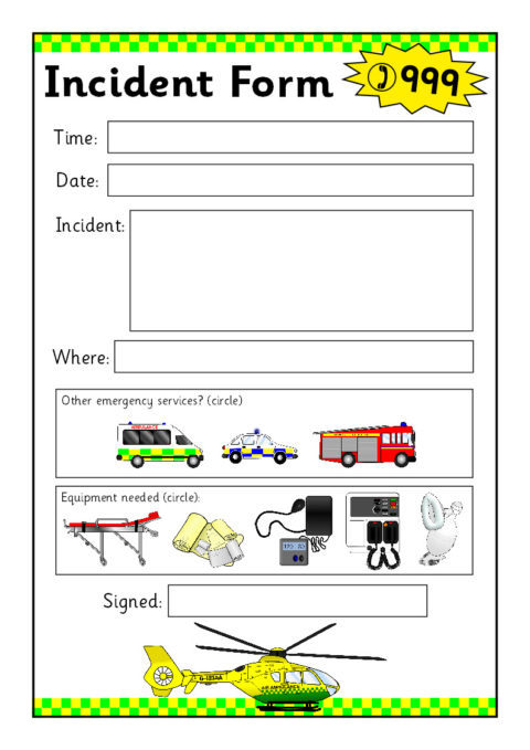 Printable incident forms to encourage writing from pupils when role-playing as paramedics.