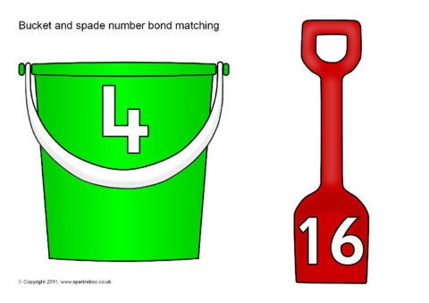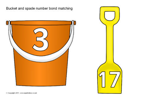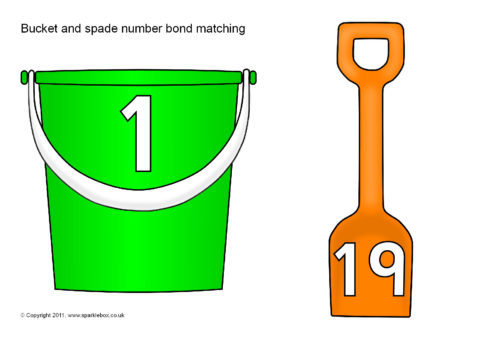Printable buckets and spades with the numbers from 0 to 20 where children can match them to make number bonds up to 20.