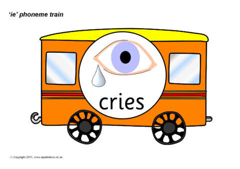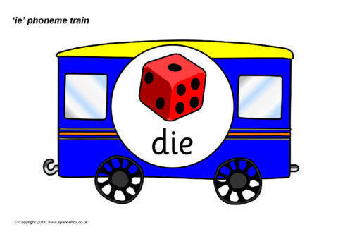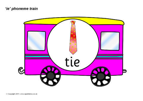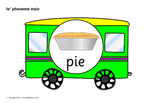 A printable train engine and carriages featuring pictures of objects that have the phoneme ‘ie’.