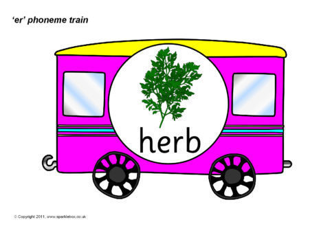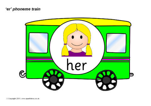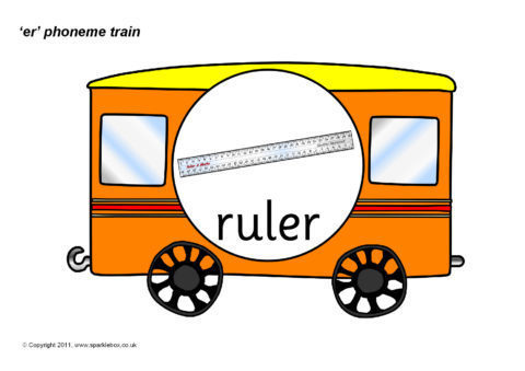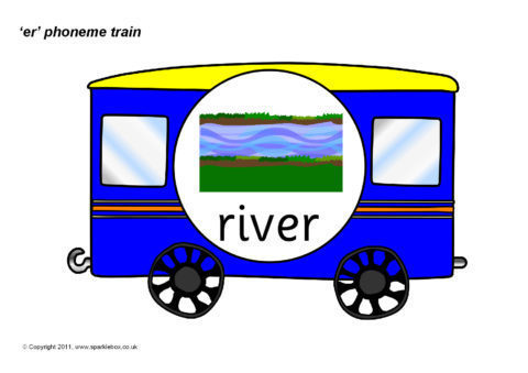 A printable train engine and carriages featuring pictures of objects that have the phoneme ‘er’.