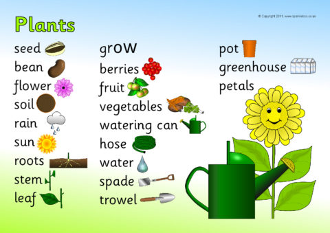 A printable word mat featuring words and pictures linked to plants and plant growth.