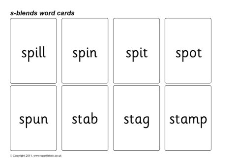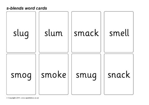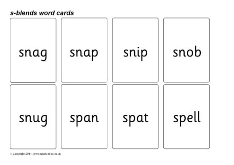 Simple printable flash cards featuring basic words beginning with s-blends.
