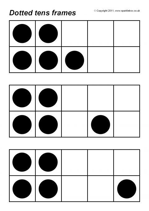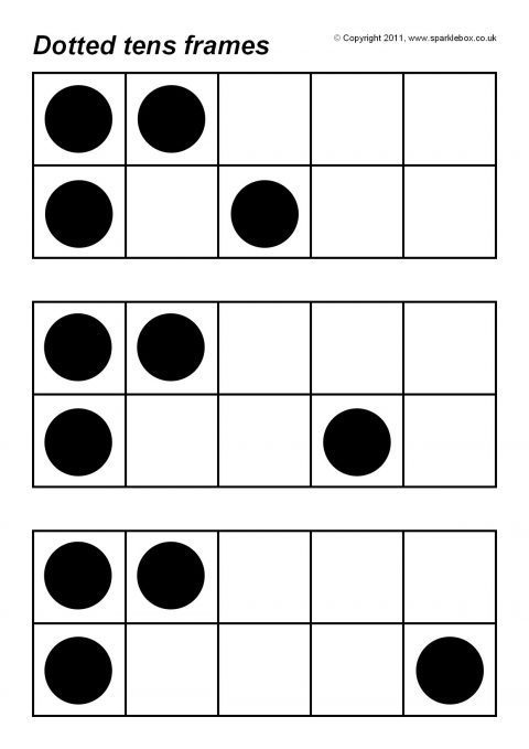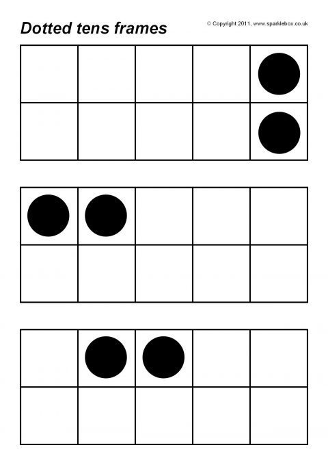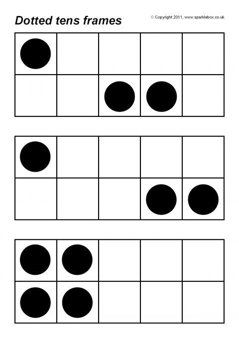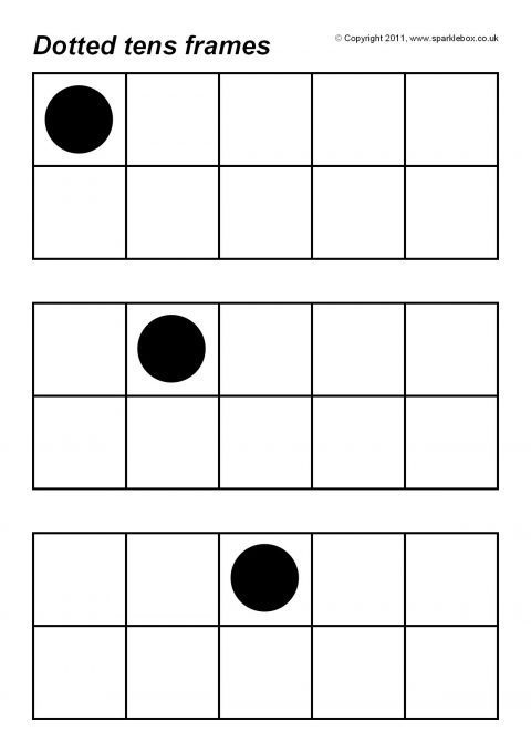 A large set of printable tens frames with different combinations of dots on each frame for numbers from 1 up to 10.