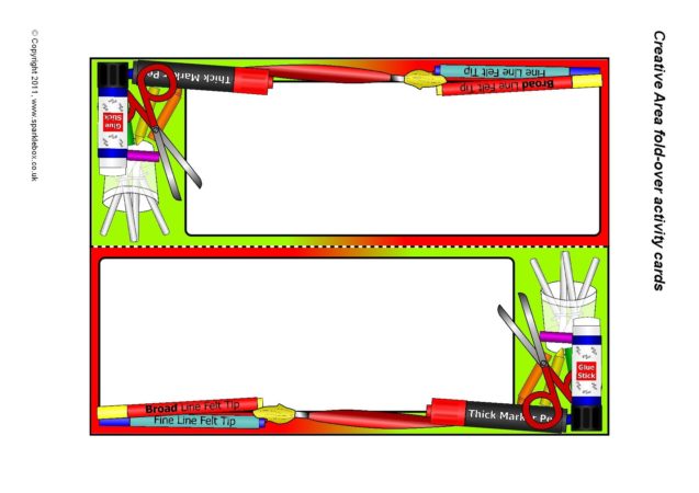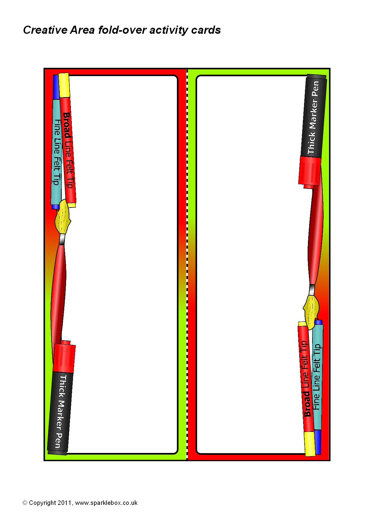 Editable fold-over cards to place in your classroom creative area - great for all sorts of uses. Use them to specify activities for pupils to complete, list pupils/groups that can play in the area or remind children of important rules to adhere to.