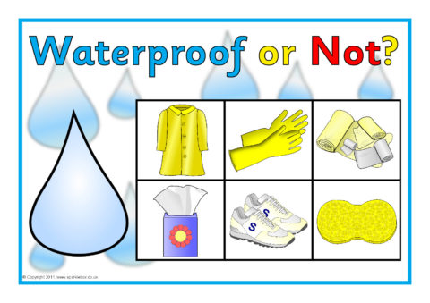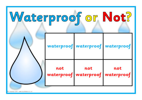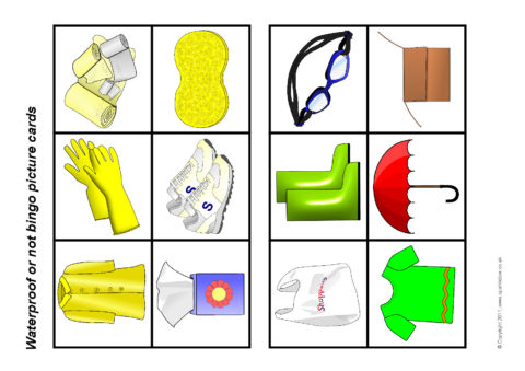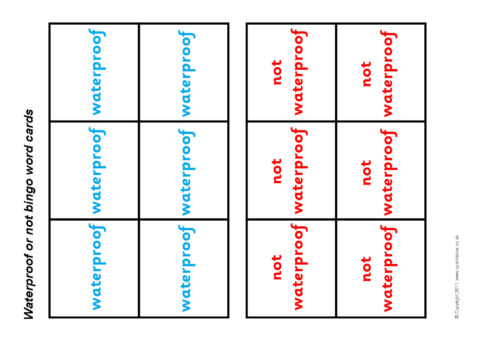 A set of bingo boards where children decide whether the objects are waterproof or not.