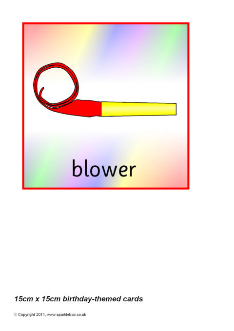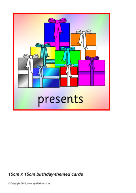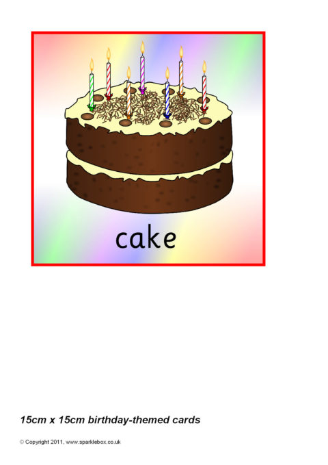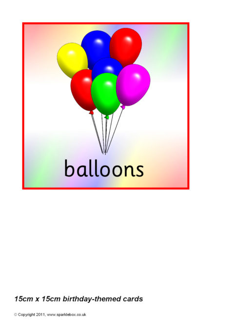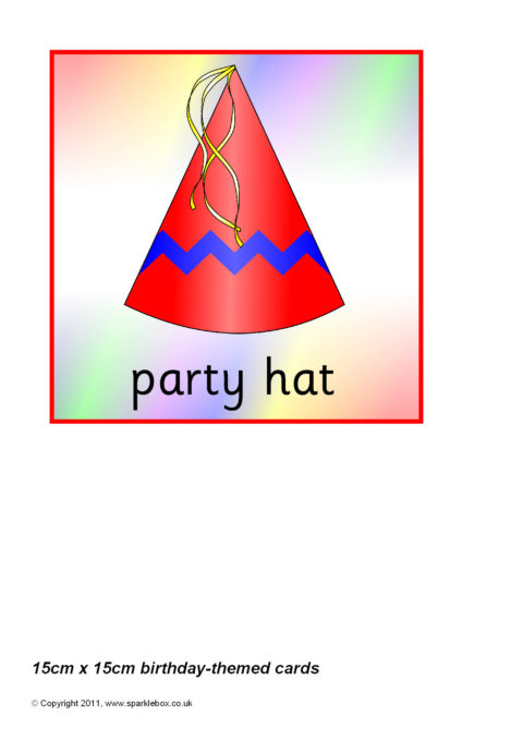 Multi-use printable cards with items linked to birthday celebrations. Each card is 15cm by 15cm and can be used for all sorts of card-based activities.