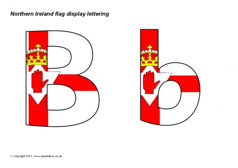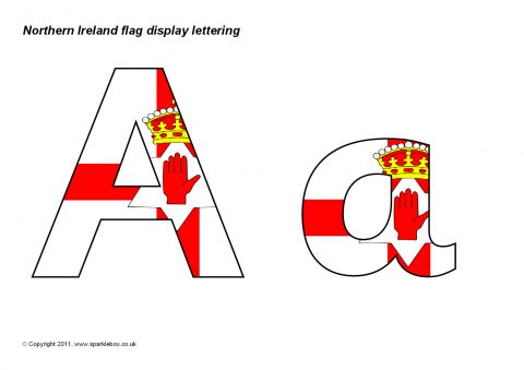 A PDF document with 26 Northern Ireland flag-themed alphabet letters (upper and lowercase). These are great for printing and cutting out for use on displays.