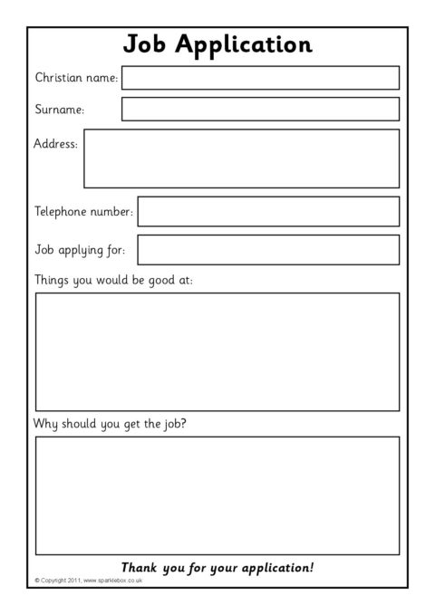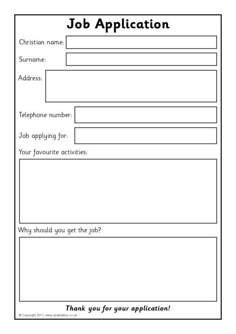 Simple printable job application writing frames where pupils can write their name, address and reasons why they should be given the job. Great for use alongside role-play activities.