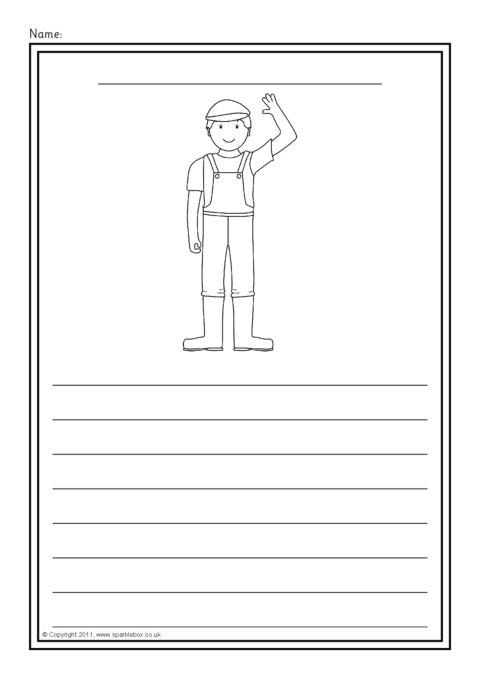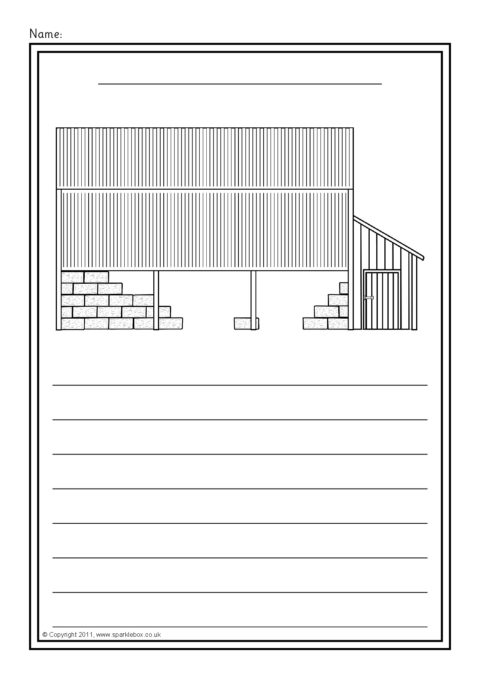 A set of simple printable sheets featuring images of farmyard items and animals for children to colour along with writing lines for topic-related writing.