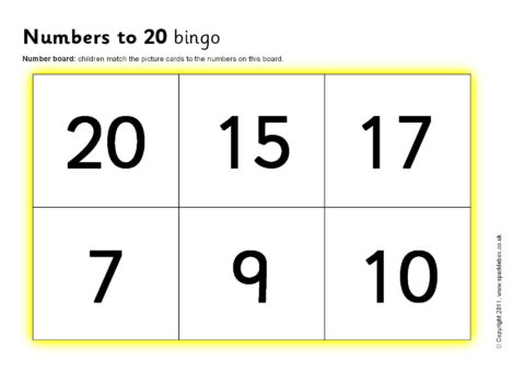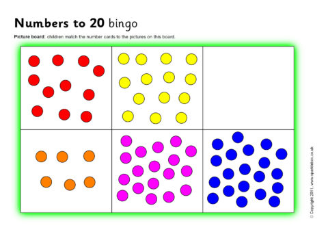A set of bingo boards and cards where pupils match the numbers (0-20) to the corresponding picture sets.
