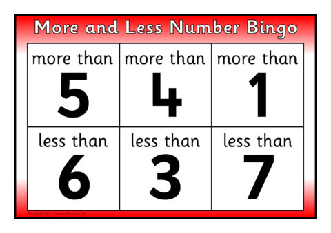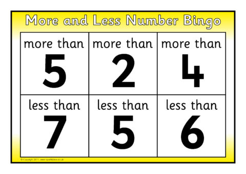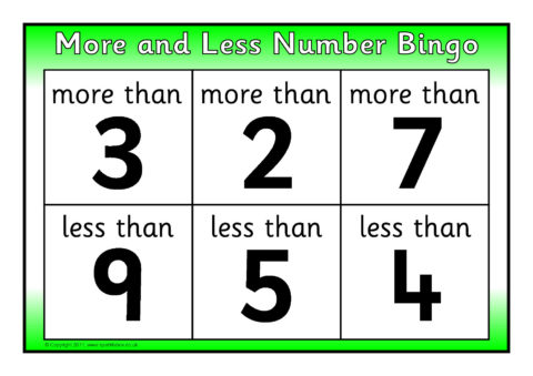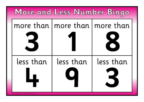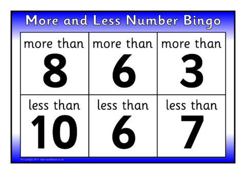 A set of printable bingo boards and cards where children match together the number cards with more/less to the spaces on their board.