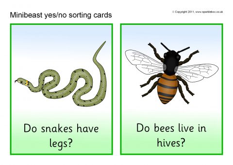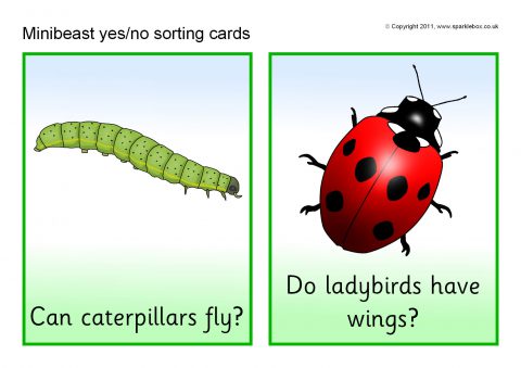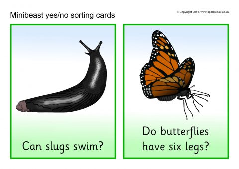 Printable cards posing questions about minibeasts with yes or no answers. Pupils sort the cards into separate yes and no piles.
