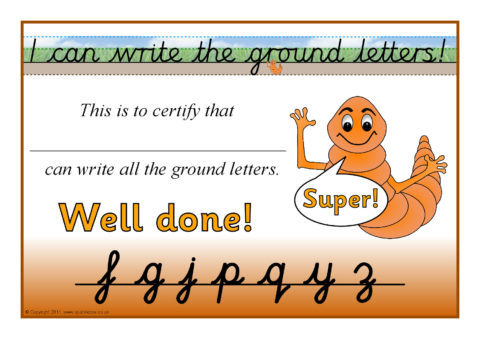 Printable certificates to present to children when they can write letters that go into the ground, letters that stay in the grass and letters that reach to the sky.