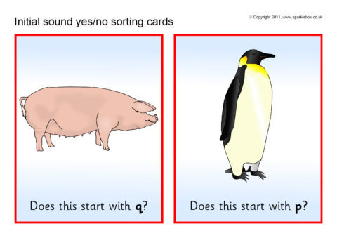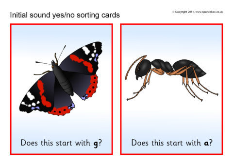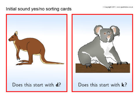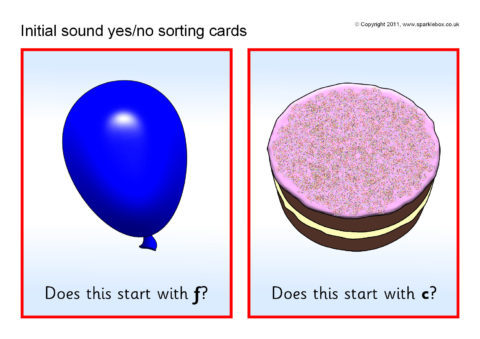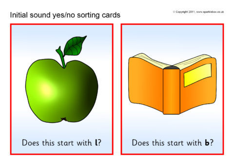 A set of cards posing questions with yes/no answers about the initial sounds of items. Pupils sort the cards into two piles for ‘yes’ and ‘no’.