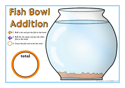 Printable desktop activity mats where children roll a dice and place two types of fish in the fish bowl and add them together.