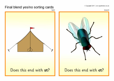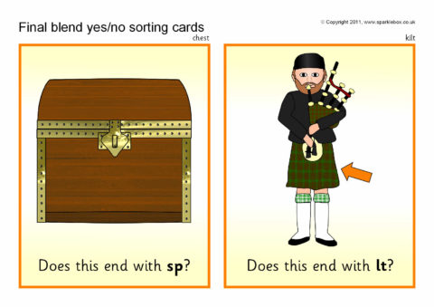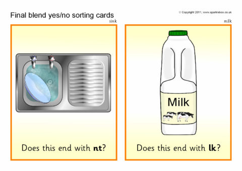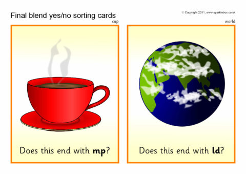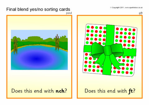 A set of cards posing questions with yes/no answers about the final blends of words. Pupils sort the cards into two piles for ‘yes’ and ‘no’.