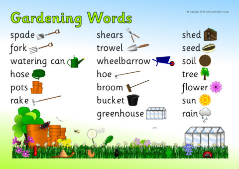 A printable word mat featuring words and pictures linked to gardening.