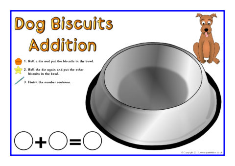 Printable desktop activity mats where children roll a die and place two types of dog biscuits in the bowl and add them together.