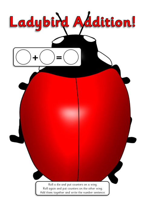 A printable desktop activity mat where children roll a dice and place counters on the ladybird wings and add them together.