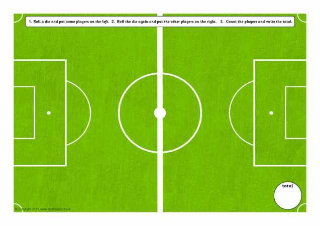 Printable desktop activity mats where children roll a die and place football players on each side of the pitch and add them together. Includes A4 and A3 versions.
