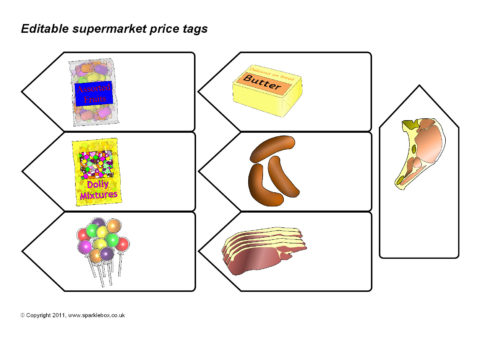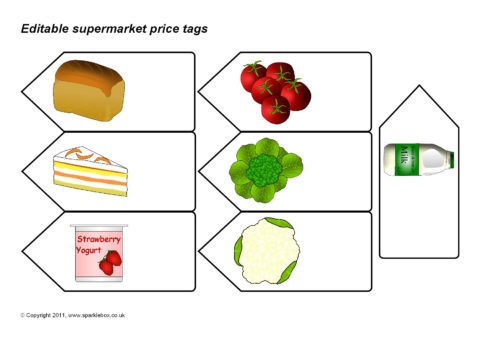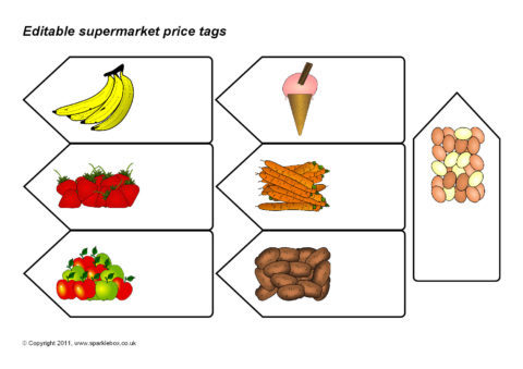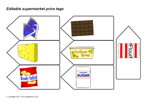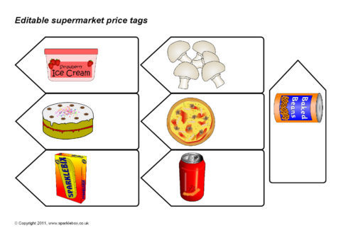 Add your own prices to a selection of price tags featuring supermarket goods.