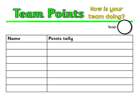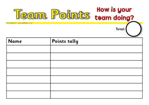 A set of printable team points record charts to monitor your school/class team’s progress each week or term. Includes space to enter the team name and pupil names. Charts can be assembled at different lengths to suit the size of your teams.