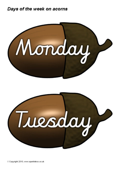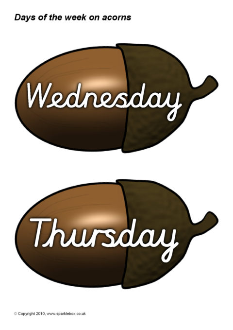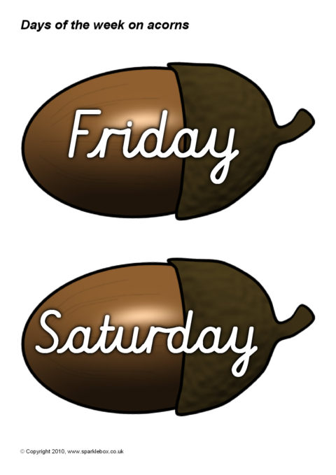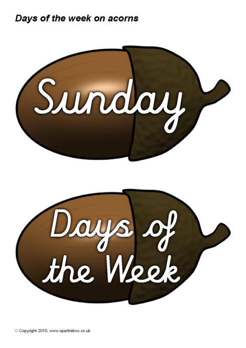 The days of the week in cursive script presented on acorns. Ideal for use with your classroom calendar.
