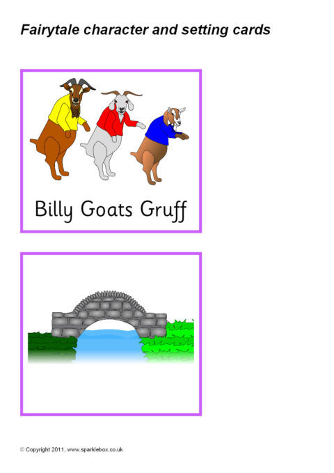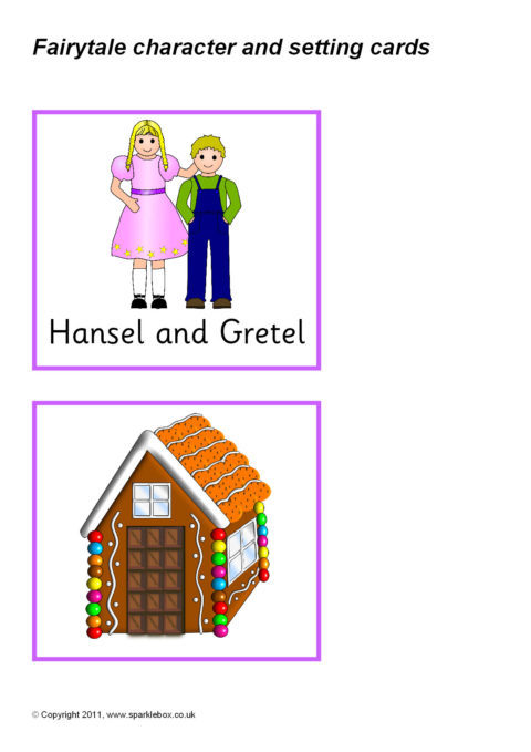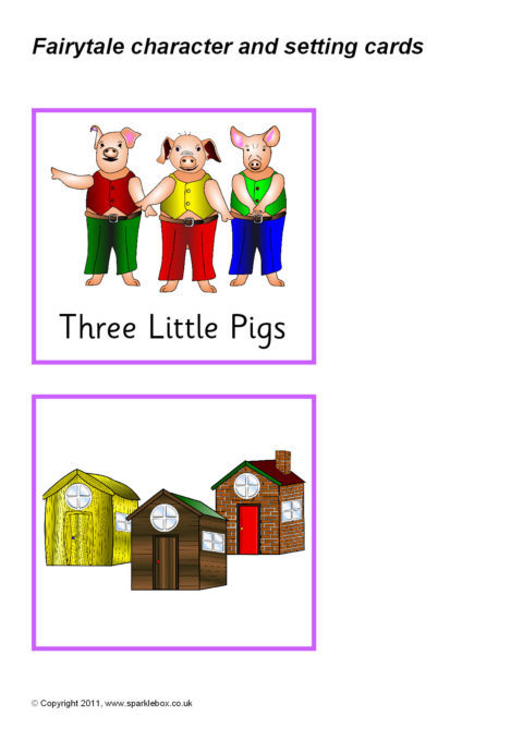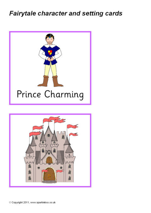 A set of carts featuring various well-known fairytale characters and the corresponding story settings for pupils to discuss and match together.