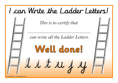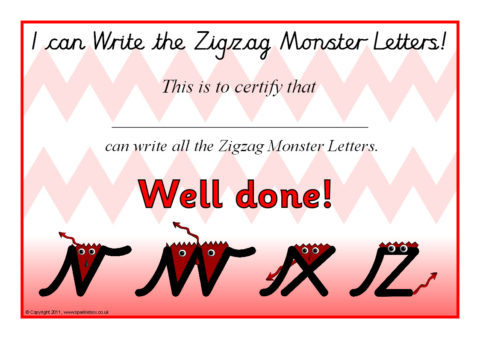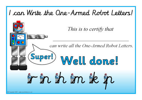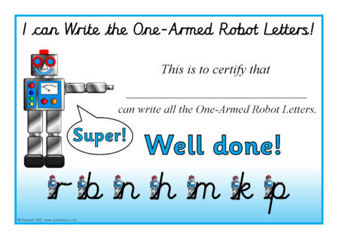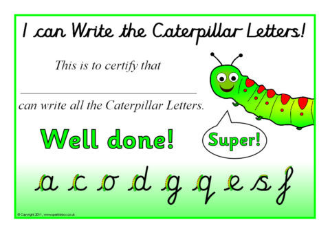 Simple certificates to present to children once they can write the ‘caterpillar letters’, ‘ladder letters’, ‘one-armed robot letters’ and ‘zigzag monster letters’.