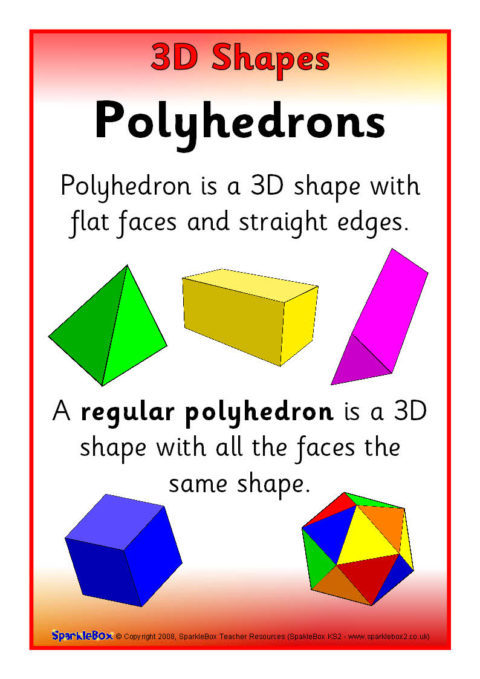 A colourful set of printable posters with information about 3D shapes. They explain the properties of 3D shapes such as faces, indices and how they are measured, together with fact and question sheets about prisms and polyhedrons.
