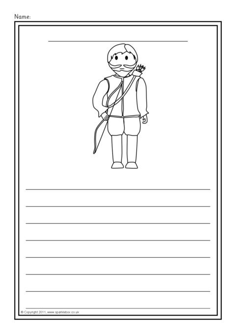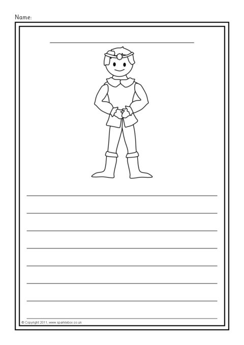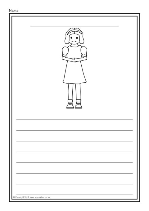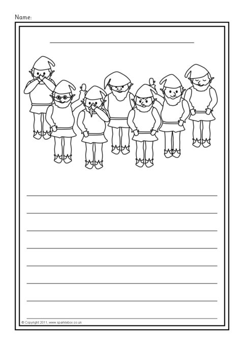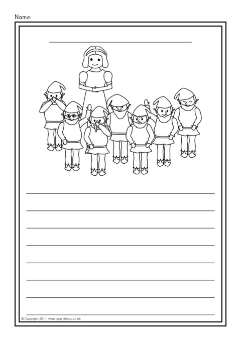 A set of simple printable sheets featuring images from the story of Snow White and the Seven Dwarfs for children to colour along with writing lines for story-related writing.