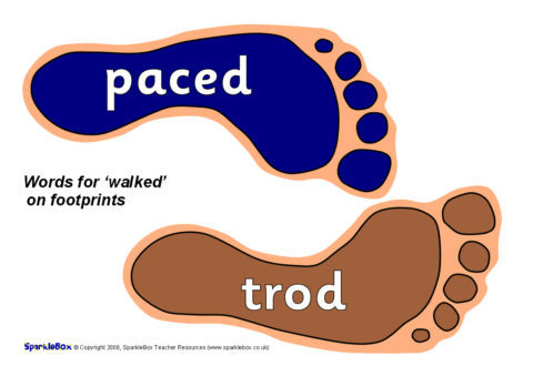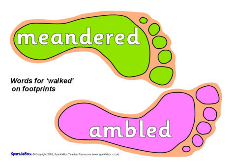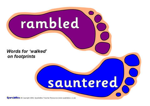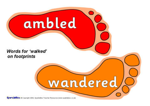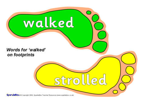 A set of colourful footprints showing various alternative words for ‘walked’. Great as visual prompts for children’s writing.