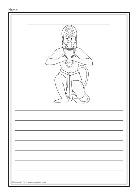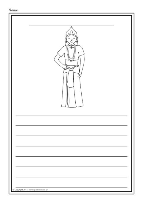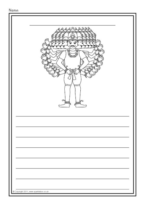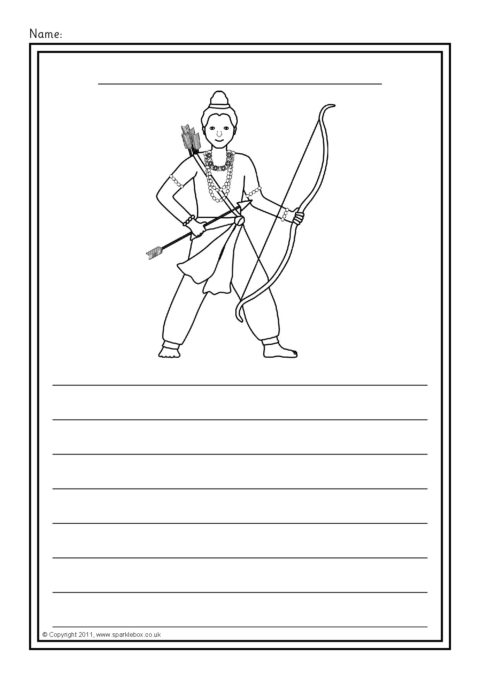 A set of simple printable sheets featuring images from the story of Rama and Sita for children to colour along with writing lines for story-related writing.