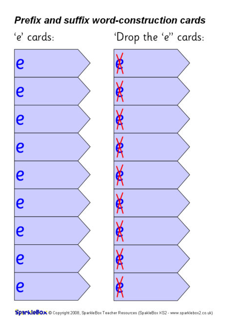 A set of printable cards for pupils to construct words with prefixes and suffixes. They start with a root word and can add green prefixes, red suffixes and use the ‘e’ or ‘i’ cards when necessary.