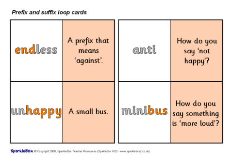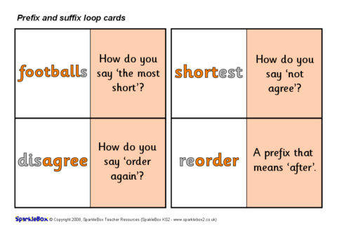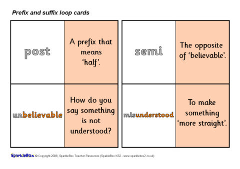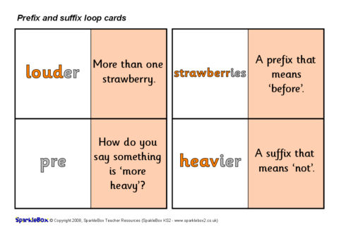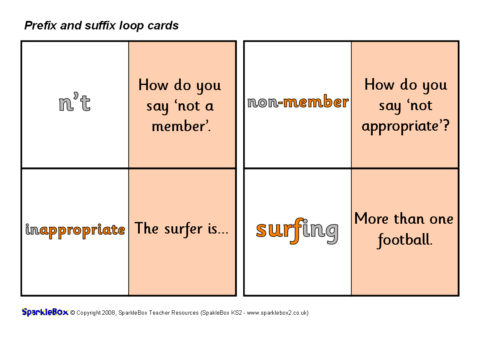 A set of 30 loop cards with questions and words linked to various prefixes and suffixes. Great for whole-class or smaller-group game where one child calls out the start card and the pupils then match/call out the corresponding cards until the game ‘loops’ back to the original child. Ideal for teaching different prefixes and suffixes.