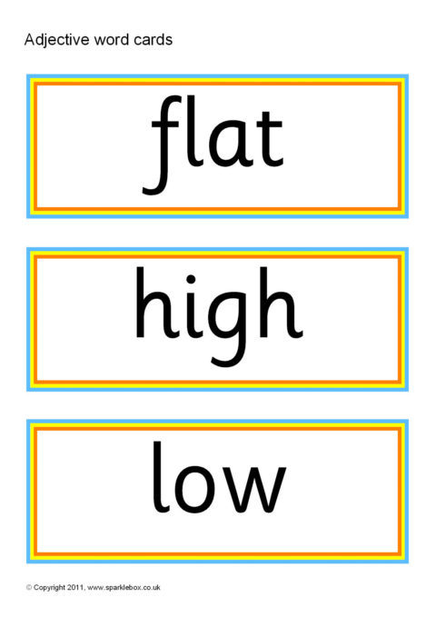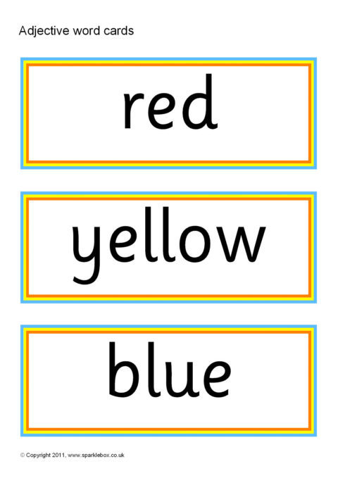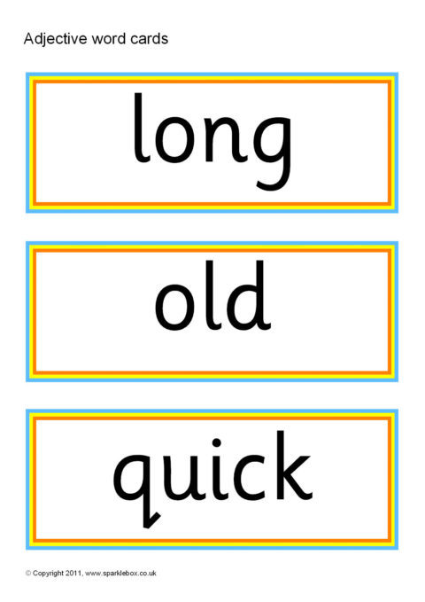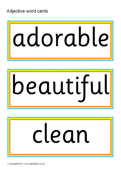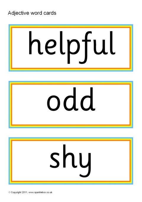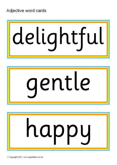 A large selection of adjectives presented on simple word cards with coloured borders.