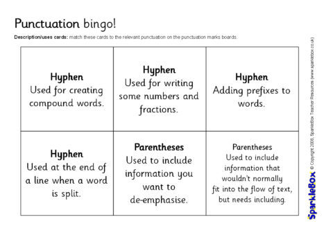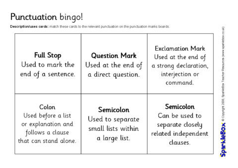 A set of printable bingo boards featuring punctuation marks and corresponding descriptions/uses.  Includes punctuation boards, description boards as well as punctuation cards and description cards for matching.
