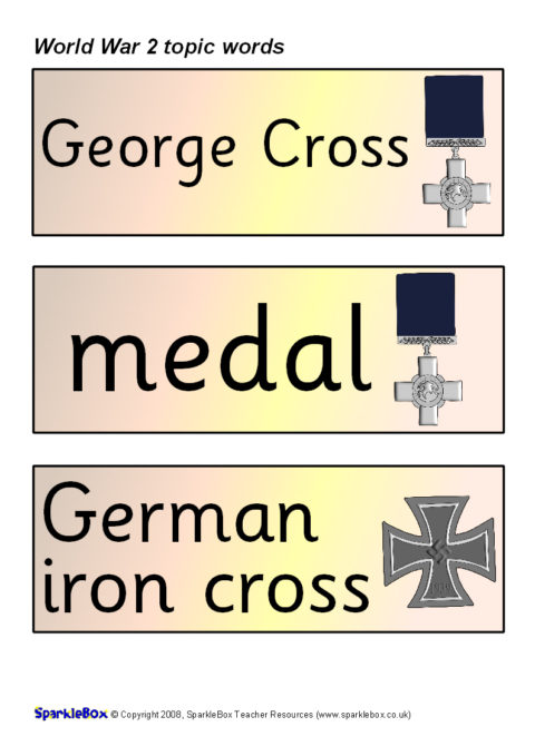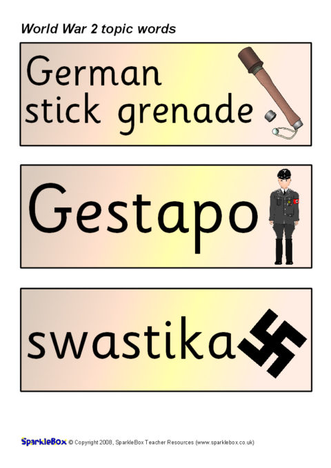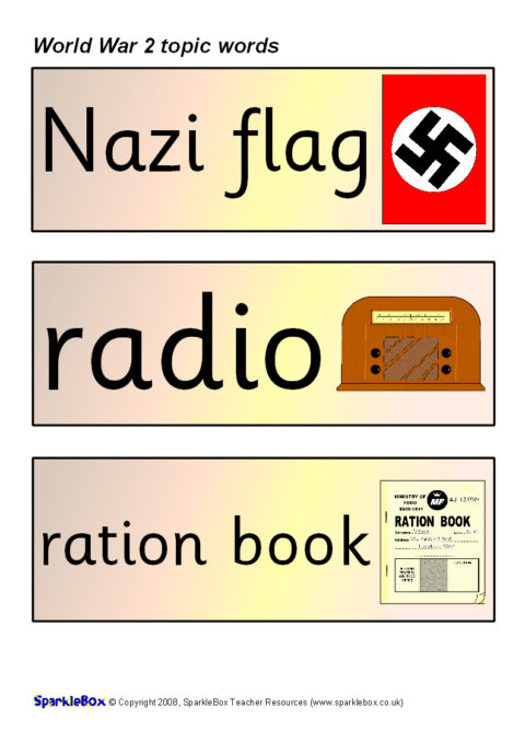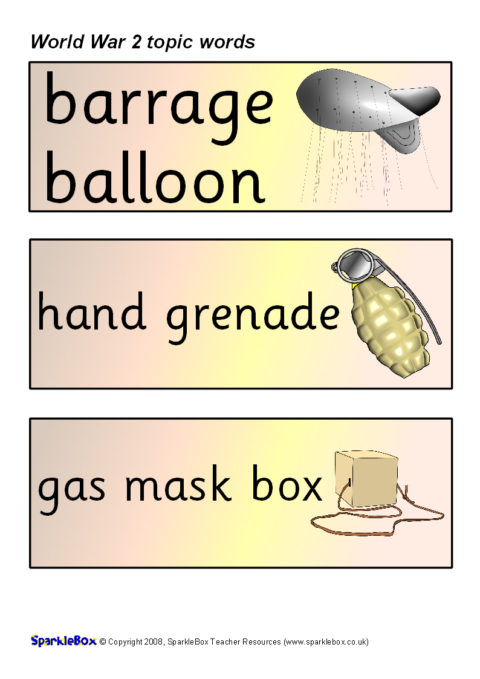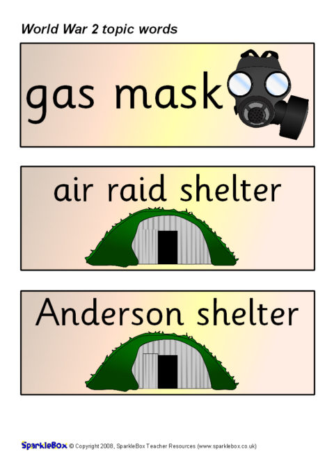 A useful set of 29 words, most with pictures, for a topic on World War Two. Includes words such as ‘air raid shelter’, ‘gas mask’, ‘Adolf Hitler’, ‘soldier’, ‘medal’ and many more. These are ideal for topic discussion, classroom displays or for use as part of a word bank.