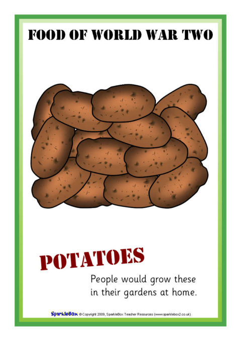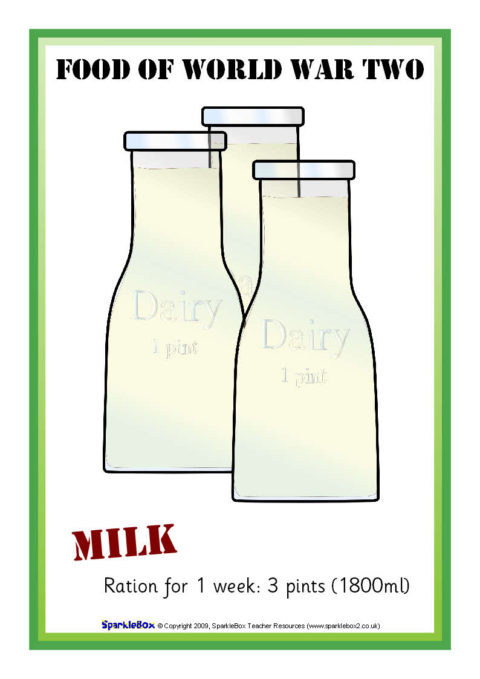 A set of printable posters that include pictures of rationed food, and the weekly amounts allowed, in England during World War 2.