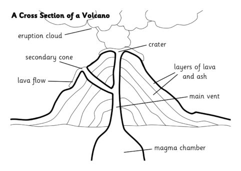 A simple printable sheet showing a cross section of a typical active volcano.