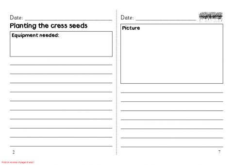 Printable cress diary booklets for pupils to fill out to record the growth of their cress. Includes spaces to write about how they planted the seeds and record their over a number of days or weeks.