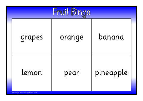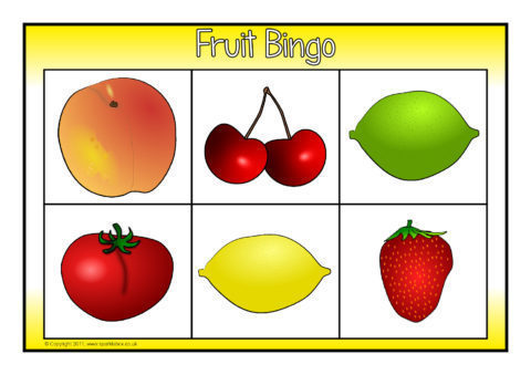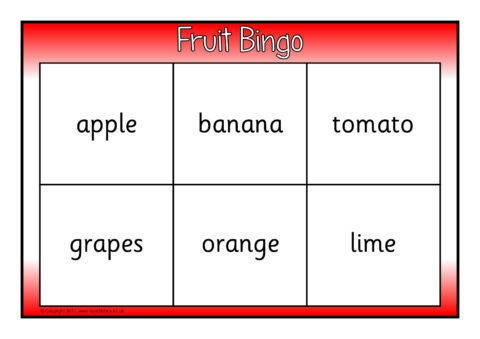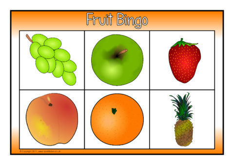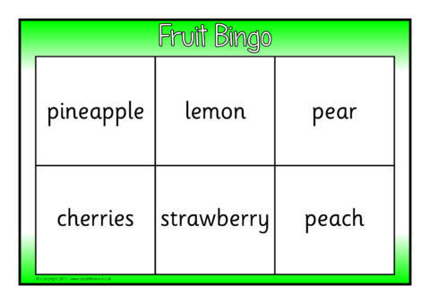 A set of bingo boards and picture cards featuring a selection of fruit. Includes both word and picture boards.