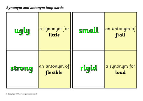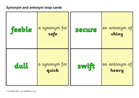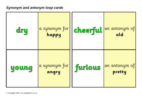 A set of 30 loop cards with various synonyms and antonyms Great for whole-class or smaller-group phonics game where one child calls out the start card and the pupils then match/call out the corresponding cards until the game ‘loops’ back to the original child. Ideal for teaching the difference between synonym and antonym.