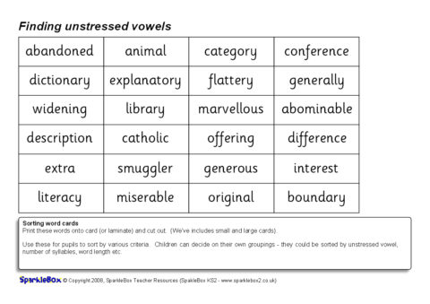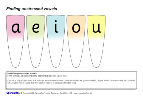 A couple of resources for activities encouraging pupils to look at and listen to words and find the unstressed vowels. Includes vowel fans and word cards for sorting.