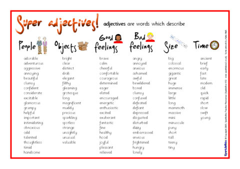 A simple word mat listing lots of interesting adjectives to describe people, objects, feelings, size and time.
