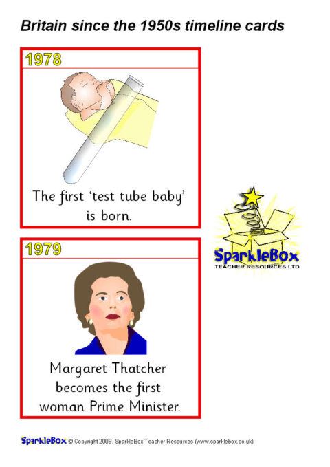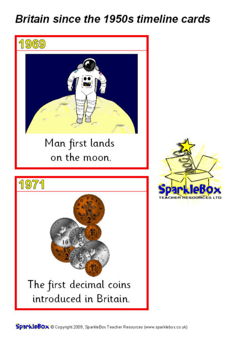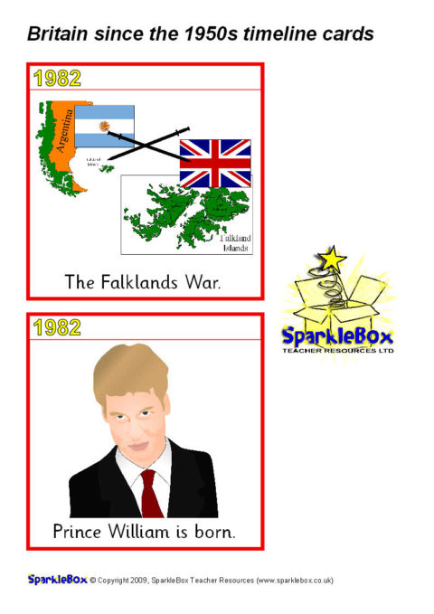 A set of printable cards showing key events in British history from the 1950s-1990s. Great for sequencing activities or for use on classroom displays.