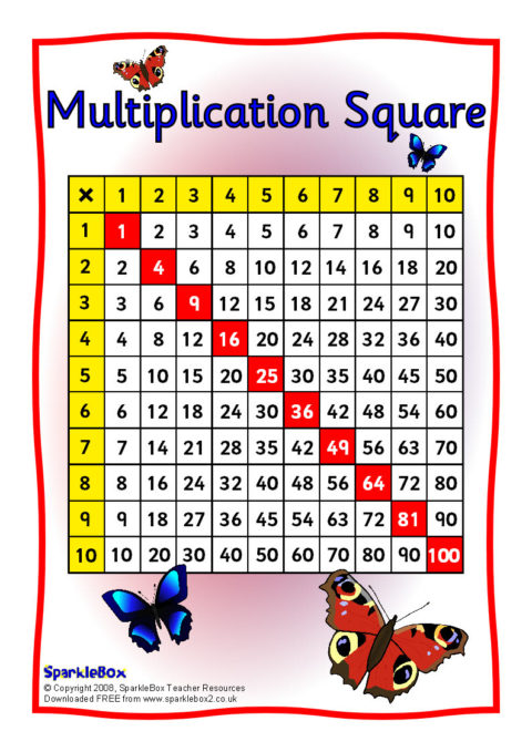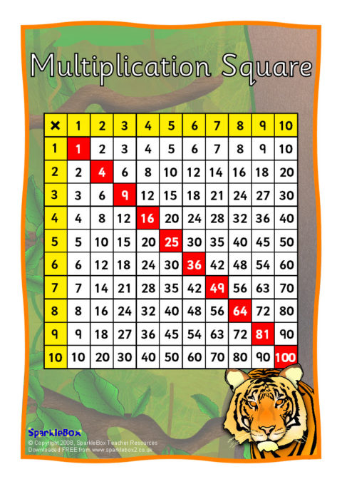 Print out and laminate these colourful multiplication square sheets for use as table-top references.